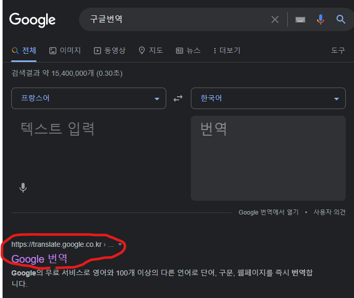 구글 번역 홈페이지 주소 url은 translate.google.co.kr 입니다만 구글의 경우 텍스트 번역이 먼저 나오고 아래쪽에서 Google 번역을 찾으시면 됩니다.