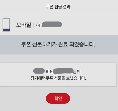 선물하기 버튼을 누르면 한번 더 알림 팝업(Pop-up) 창을통해 선물하는 것이 확실한지 확인을 해주셔야 합니다. 쿠폰 선물하기가 완료되면 아래와 같은 쿠폰 선물 결과로 다시 확인하실 수 있습니다.