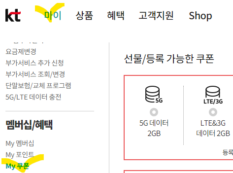 - PC용 홈페이지 : kt > 마이 > 멤버십/혜택 > My 쿠폰