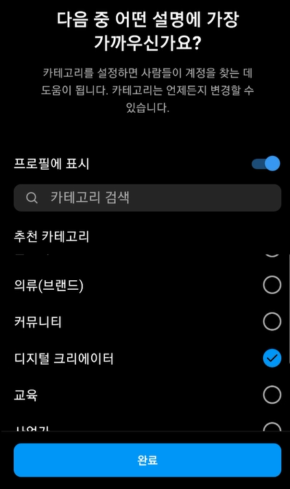 본인의 인스타그램 계정의 카테고리를 선택할 수 있습니다. 찾기 어려운 경우 검색 기능도 지원하니 프로페셔널 계정으로 운영하시는 방향에 맞게 선택하시기 바랍니다.