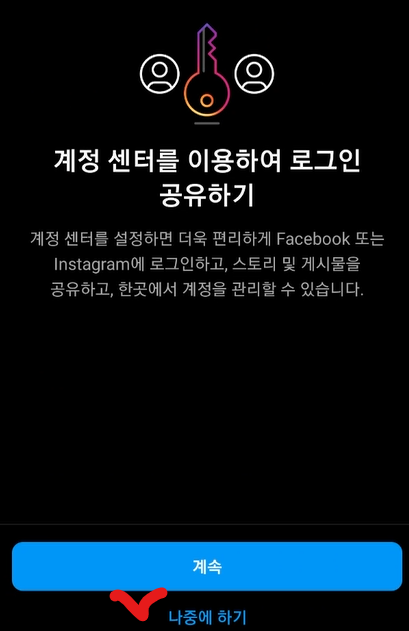크리에이터 여부를 선택한 다음은 계정 센터를 설정할 수 있는데요. 본 글이 프로페셔널 계정으로의 변경이기 때문에 여기서는 그냥 나중에 하기를 클릭하고 넘어가고자 합니다.