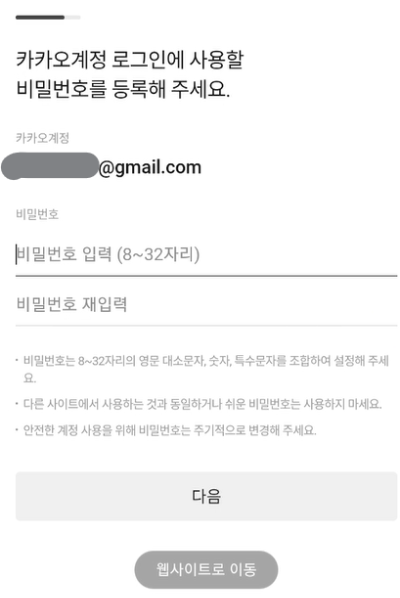 인증번호를 입력하고 다음을 누른 다음, 카카오 계정 로그인에 사용할 비밀번호를 연속해서 2회 입력해서 등록해주시기 바랍니다.