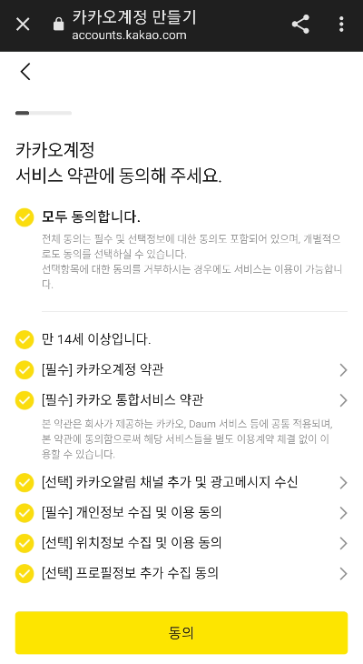 제일 먼저 동의를 구하는 것은 카카오 계정 서비스 약관입니다. 모두 동의합니다로 진행하셔도 무방합니다.