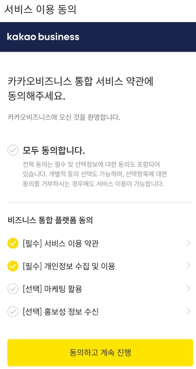 카카오 비즈니스 서비스 이용 동의 화면에서는 필수 약관에 모두 동의가 필요합니다. 모두 동의합니다. 를 체크 후 선택 항목에 대해서는 체크할지 결정해주세요.