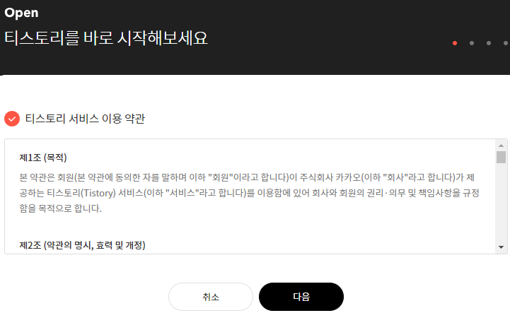 티스토리 시작과 동시에 서비스 이용을 위한 약관을 체크하고 확인한 후 아래에 '다음' 버튼을 눌러주세요.