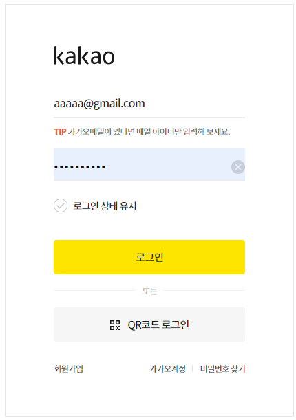 kakao 로그인 화면에서 새로 만든 카카오 계정 정보를 입력하고 로그인 버튼을 눌러주시기 바랍니다.