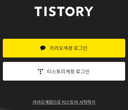 티스토리 홈페이지에 접속한 다음 시작하기 버튼을 눌러서 티스토리 로그인 화면으로 이동합니다. 현재 로그인은 카카오 계정과 티스토리 계정 두 개의 계정 중 하나를 선택해서 로그인할 수 있습니다.