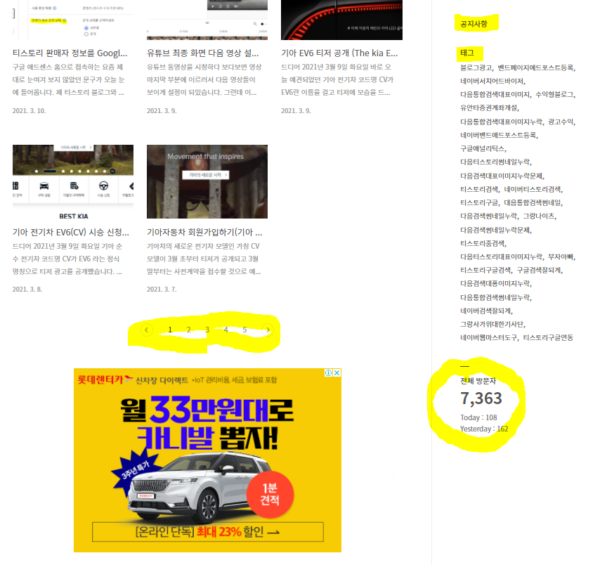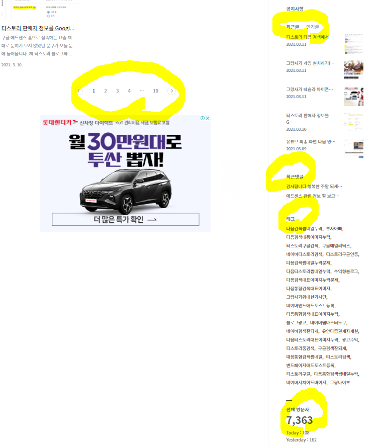 미리보기에서 보이는 하단 부분은, 페이지 숫자가 보이고, 우측은 공지사항, 태그, 전체 방문자 카운터 순으로 조회되고 있습니다.