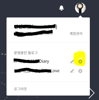 본인 계정을 마우스로 클릭해서 계정 관리의 서브 메뉴들이 열리면 운영하고 계시는 여러 개의 블로그 중에서 수정하고자 하는 블로그의 설정(톱니바퀴)을 클릭합니다.