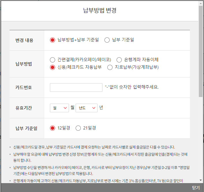- 납부방법 + 납부 기준일 둘 다 변경 : 납부방법 변경 시 선택