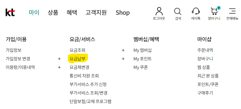 kt 홈페이지에 로그인한 다음 상단의 메뉴들 중에서 마이를 선택합니다. 마이 메뉴에서 요금/서비스 아래에 보이는 요금납부 메뉴로 이동하세요.