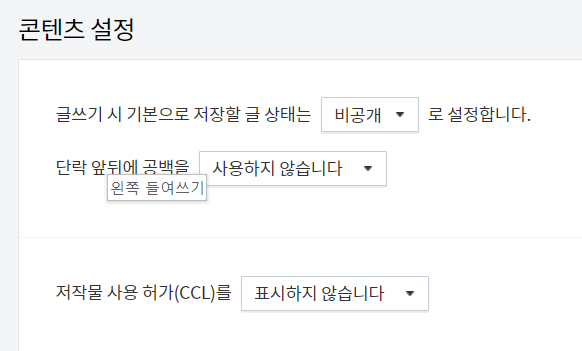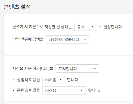 티스토리 기본 글 상태, 단락 공백 사용, 저작물 사용 허가 표시(CCL) 등 블로그 글 콘텐츠의 여러 설정사항에 대해 변경하는 방법을 다음의 테이블과 같이 요약해보았습니다.