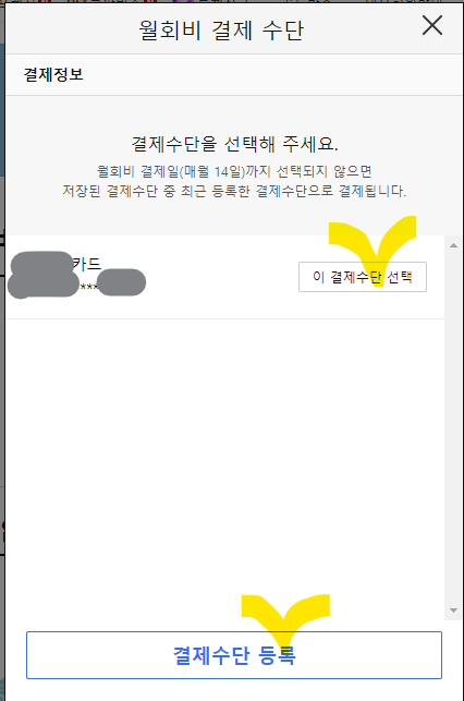 결제수단 관리 버튼을 눌러서 '월회비 결제 수단'이라는 팝업(Pop-up) 창이 열리면 좀 전에 쿠팡 결제수단으로 등록했던 카드를 '이 결제수단 선택' 버튼을 눌러서 선택해주시면 됩니다.