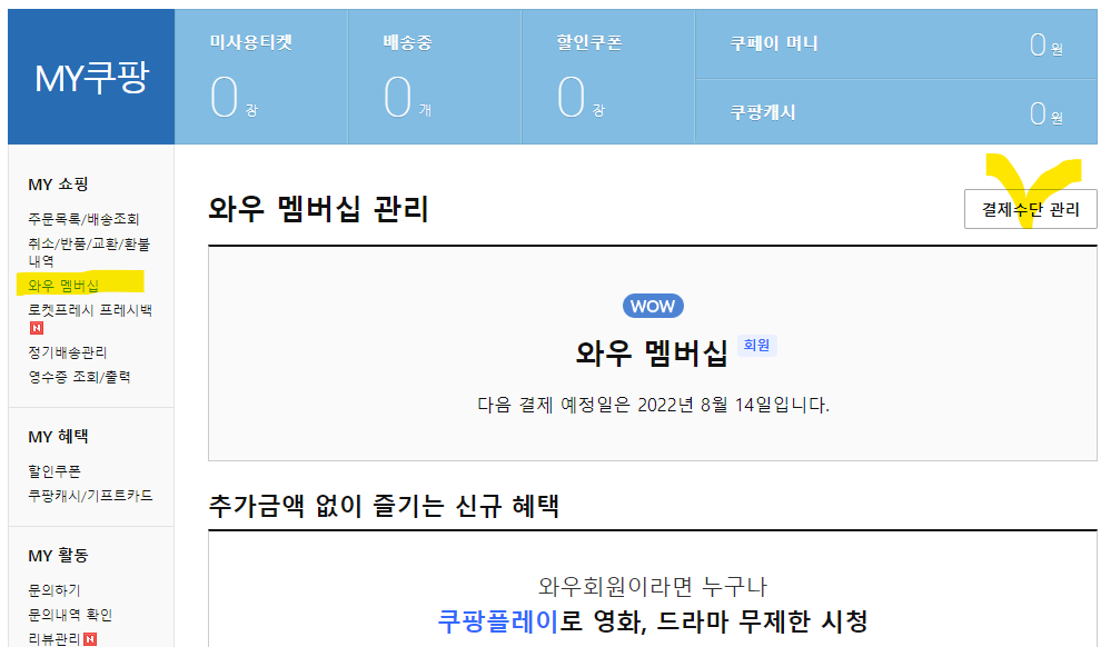 - 와우 멤버십 : 와우 멤버십 관리 화면의 우측 상단에 '결제수단 관리' 버튼 확인