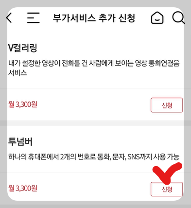 - 마이 > 요금/서비스 > 부가서비스 추가 신청