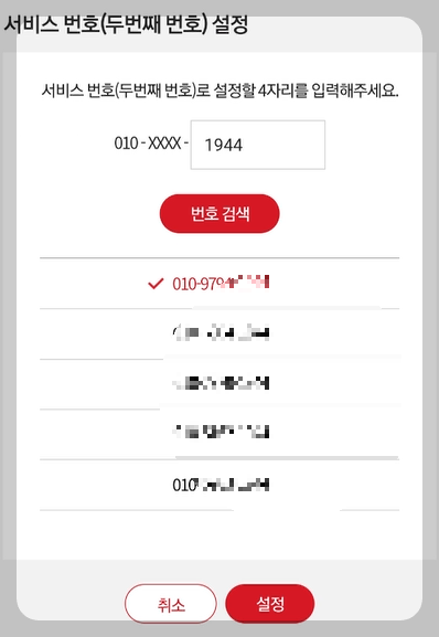투넘버 신청을 누르고 두 번째 서비스 번호로 설정할 마지막 숫자 4자리를 입력한 다음 번호 검색을 통해 사용 가능한 번호를 선택한 다음 설정 버튼을 눌러주시기 바랍니다.