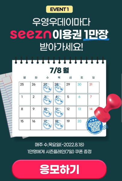 우영우가 방송되는 매주 수요일과 목요일 시즌 이용권 1만 장을 받아가는 이벤트에 응모하기 위해서 '응모하기' 버튼을 눌러주세요.
