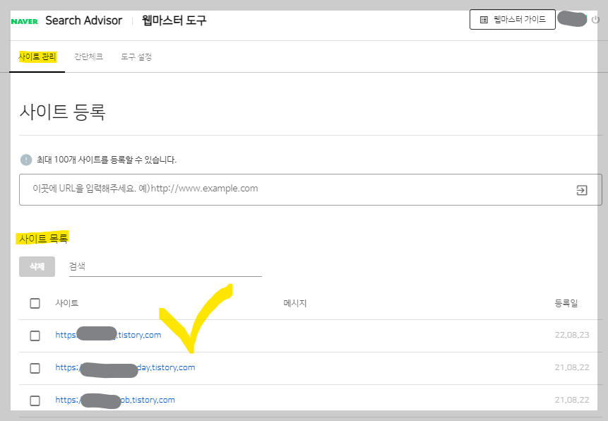 네이버 서치 어드바이저의 웹마스터 도구 메뉴를 선택하면 사이트 관리 탭(Tap) 메뉴에서 이미 등록된 사이트 목록을 조회하실 수 있으며 여기에 RSS를 제출할 티스토리 사이트도 조회한 후 클릭하세요.