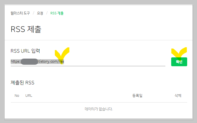 현재까지 해당 티스토리의 제출된 RSS가 없는 것으로 확인되기 때문에 RSS URL을 입력한 다음 확인 버튼을 눌러주세요. RSS URL은 티스토리 전체 URL 우측에 /rss를 추가한 테스트입니다.