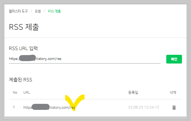 티스토리의 RSS 제출이 네이버 서치 어드바이저에서 성공적으로 완료되면 제출된 RSS 목록에 제출한 URL과 함께 등록일이 표시되면서 추가되게 됩니다. 물론 삭제와 다시 제출하는 것도 가능합니다.