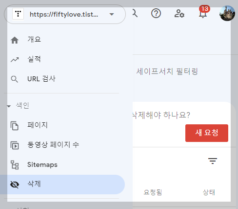 속성에 해당되는 티스토리 블로그를 선택한 다음 왼쪽 메뉴들 중 색인 카테고리 아래에 있는 삭제 메뉴를 선택합니다.