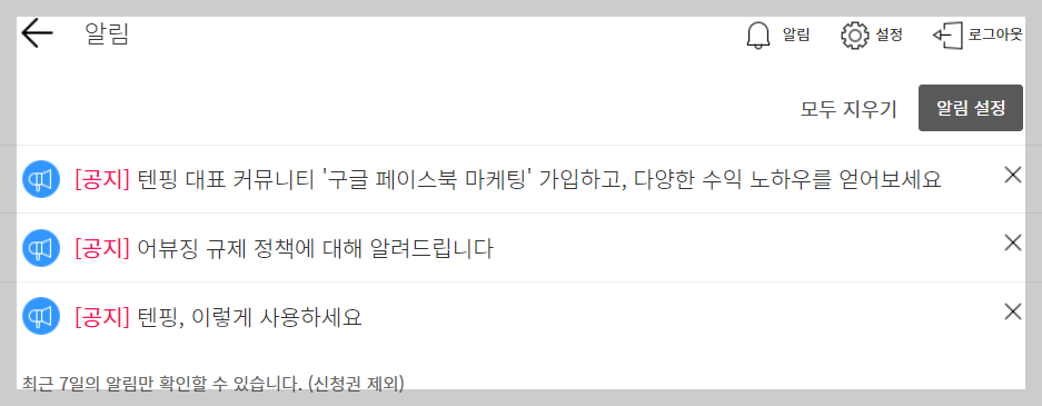 그럼 지금까지 텐핑 홈페이지 회원 가입 및 마케터 프로필 작성 방법에 대해서 알아보았습니다. 회원가입 이후 Tenping 홈페이지의 우측 상단에 알림을 클릭해 보시면 텐핑의 3가지 공지글이 도착해 있습니다. 본격적으로 텐핑 마케터 활동을 시작하기 전에 하나씩 읽어보시면 도움이 되실 것 같습니다.