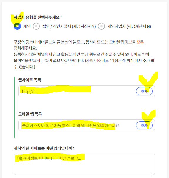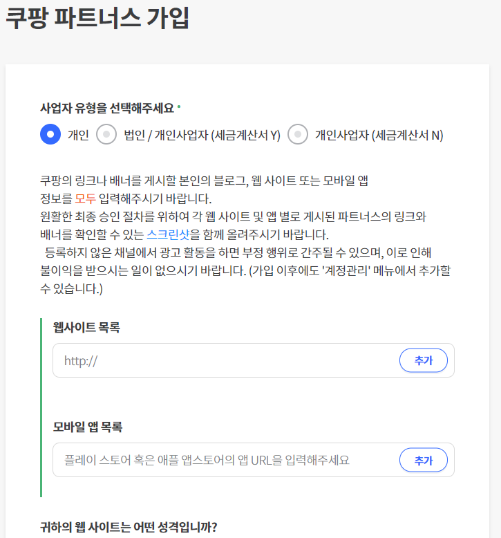 - 쿠팡 파트너스 가입 (사업자유형 : 개인)