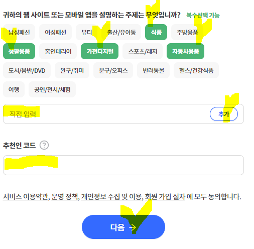 웹사이트 목록, 성격, 주제 등을 채우고 나면, 최종적으로 추천인 코드를 입력하고 '다음' 버튼을 눌러주십시요.