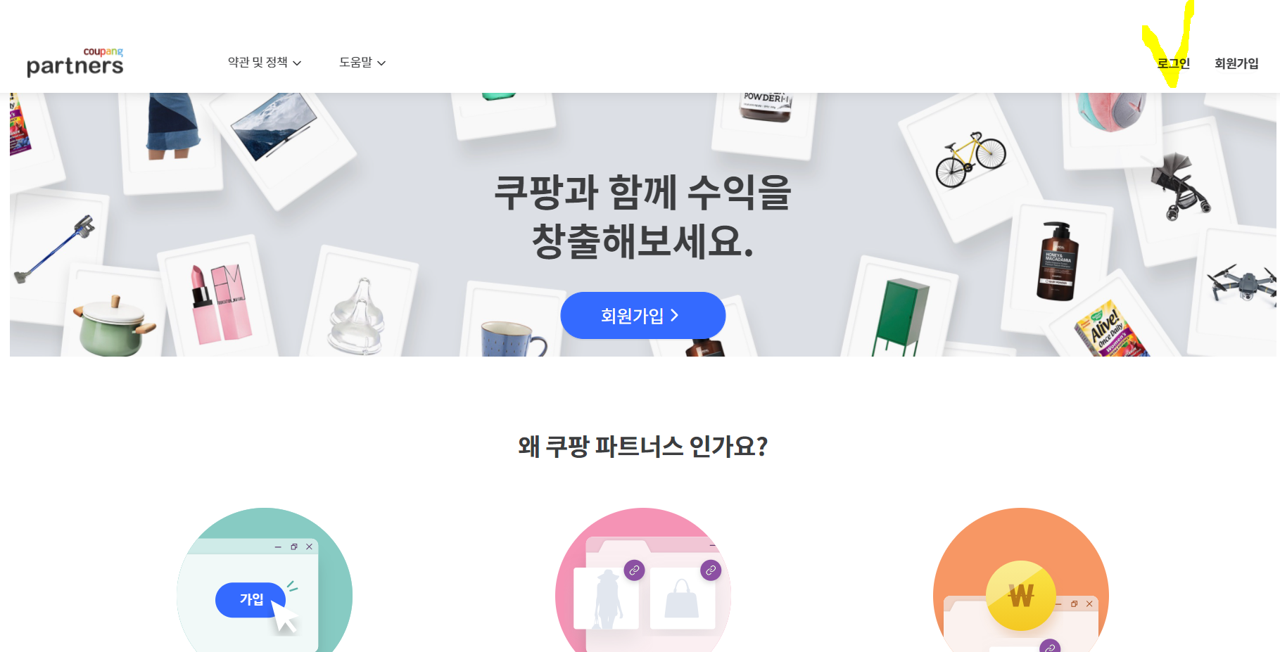 쿠팡 파트너스 홈페이지에서 회원가입이 아닌 '로그인'으로 시작하는 방법입니다.