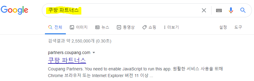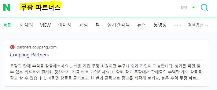 구글 검색이나 네이버 검색을 이용해서 검색창에 "쿠팡 파트너스"를 입력하고 사이트를 찾아 이동합니다.