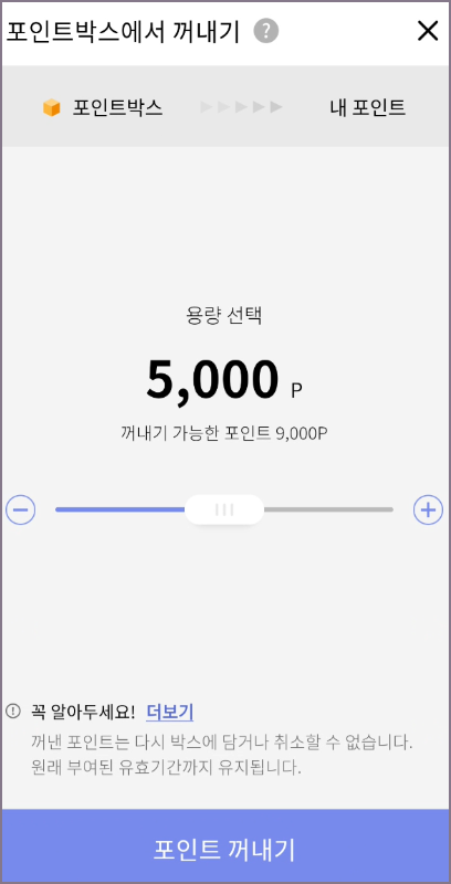 한 가족이 담기한 데이터 또는 포인트를 가져할 다른 가족 구성원은 동일한 화면에서 꺼내기를 클릭한 다음 가져갈 포인트 용량을 슬라이더를 밀어 선택하고 포인트 꺼내기를 눌러주면 본인의 포인트에 추가할 수 있습니다.