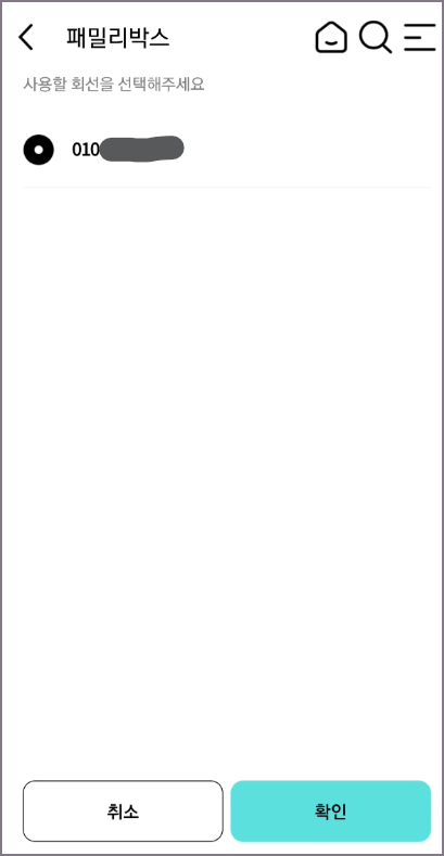 다음 화면은 패밀리박스라는 명칭의 화면입니다. 사용할 회선을 선택하라고 하는데 본인 핸드폰 번호가 체크되어 있기 때문에 선택된 상태에서 확인 버튼을 눌러줍니다. 대부분의 경우 1개의 핸드폰 번호를 이용할 것이기 때문에 2개 이상의 회선을 사용 중인 경우가 아니라면 그대로 진행하시면 됩니다.