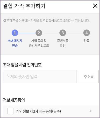 KT의 마이 케이티 앱과는 별개로 가족간 공유 목적으로 출시된 앱이 KT 패밀리 박스 앱이기 때문에 마이 케이티 앱을 이용하지 않고 바로 KT 패밀리 박스 앱을 실행해서 사용하시면 됩니다. 앱을 시작하고 우측 상단의 가족현황 아이콘을 클릭해서 결함가족을 추가하고 시작하시면 됩니다.