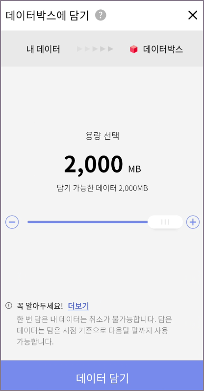 결합하여 공유할 가족이 모두 등록되면 데이터박스와 포인트박스를 각각 이용하여 남는 가족 구성원이 담기를 먼저 해주면 됩니다. 담기 버튼을 클릭하고 용량을 선택한 다음 데이터 담기를 눌러주면 됩니다.
