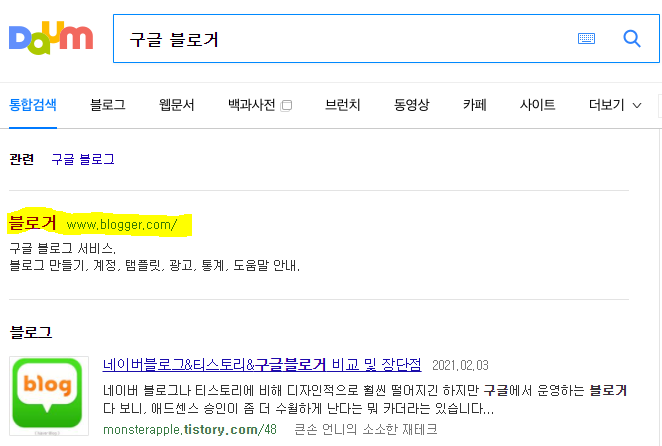 구글검색에서는 "구글 블로그"로도 찾으면 되는데, 다음에서는 "구글 블로거"라고 정확하게 써야 검색이 됩니다.