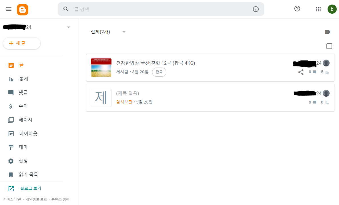 다음 내용은 구글 블로그 블로거에 로그인한 모습과 메뉴 구성을 보여줍니다.