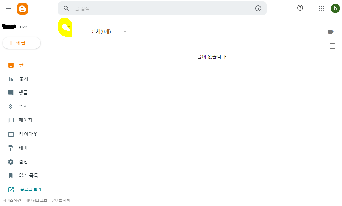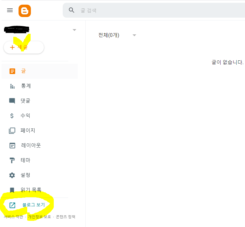 여기까지의 새로운 구글 블로그 생성하는 작업으로 바로 "새 글"을 작성해서 블로그 활동을 시작하면 됩니다. 아직은 작성한 글이 하나도 없기 때문에, 좌측 메뉴 맨 하단에 보이는 "블로그 보기"를 통해서 만들어진 구글 블로그 블로거가 어떻게 보일지 먼저 확인하도록 하겠습니다.