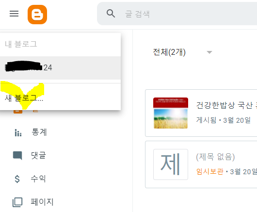 블로그 이름 우측에 있는 아래 방향 화살표(▼)를 클릭하면 현재 보유하고 있는 블로그 리스트를 볼 수 있으며, 여기에서 새로운 블로그를 추가로 만드는 것도 가능합니다.