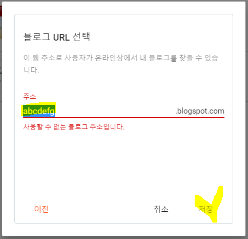 새로 만들 블로그가 갖게 될 URL을 선택하기 위해서 다음의 주소에 blogspot.com의 바로 앞에 오는 sub domain 정보에 해당하는 정보(abcde)를 입력해야 합니다.