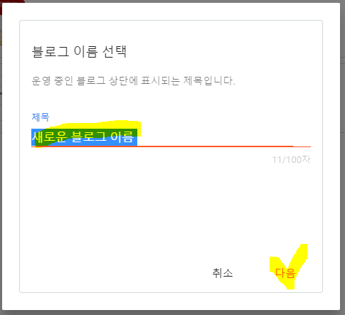 새로운 블로그의 이름을 입력하고 "다음" 버튼을 클릭합니다.