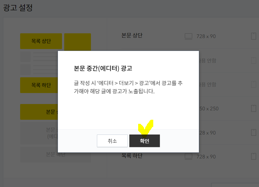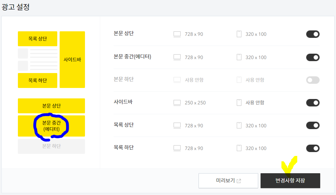 현재 저는 목록 상단, 목록하단, 사이드바와 본문의 경우 상단에만 광고를 집행하여 총 4군데만 노란색으로 선택이 되어 있습니다.