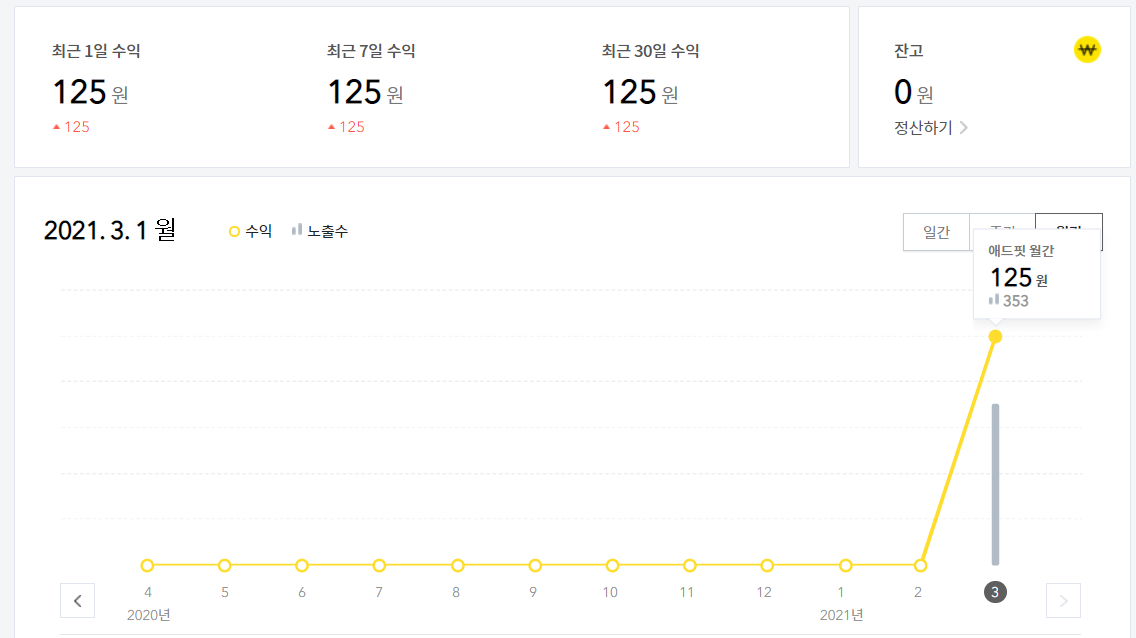 수익 하단에는 일간, 주간 월간 노출수와 수익을 보여주는 차트 그래프를 보실 수 있습니다.