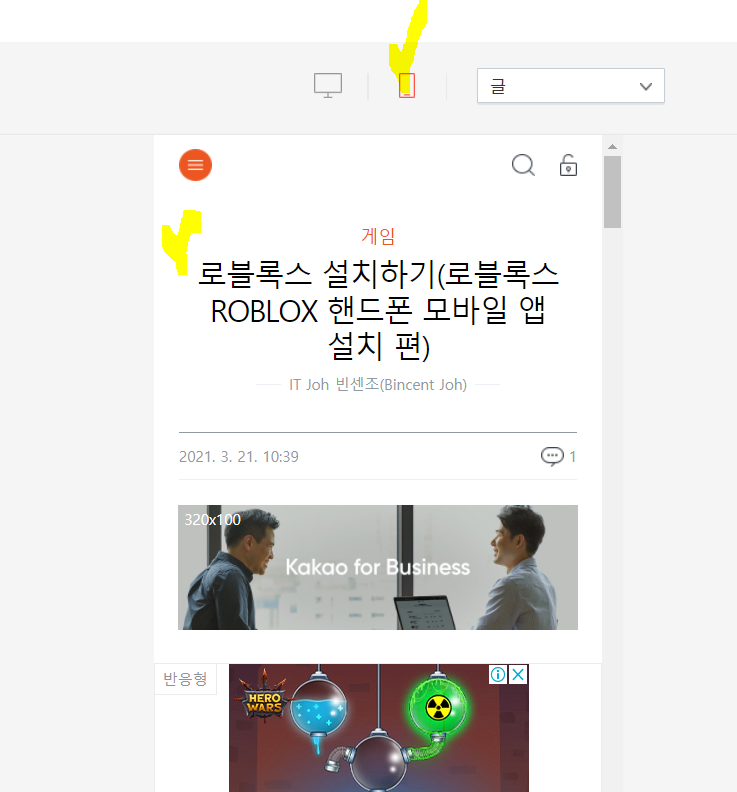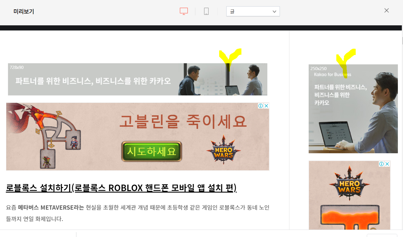 PC용 웹 화면과 모바일용 화면에서 모두 광고 위치를 설정해준 대로 광고가 정상적으로 게재되고 있음을 확인하실 수 있습니다.