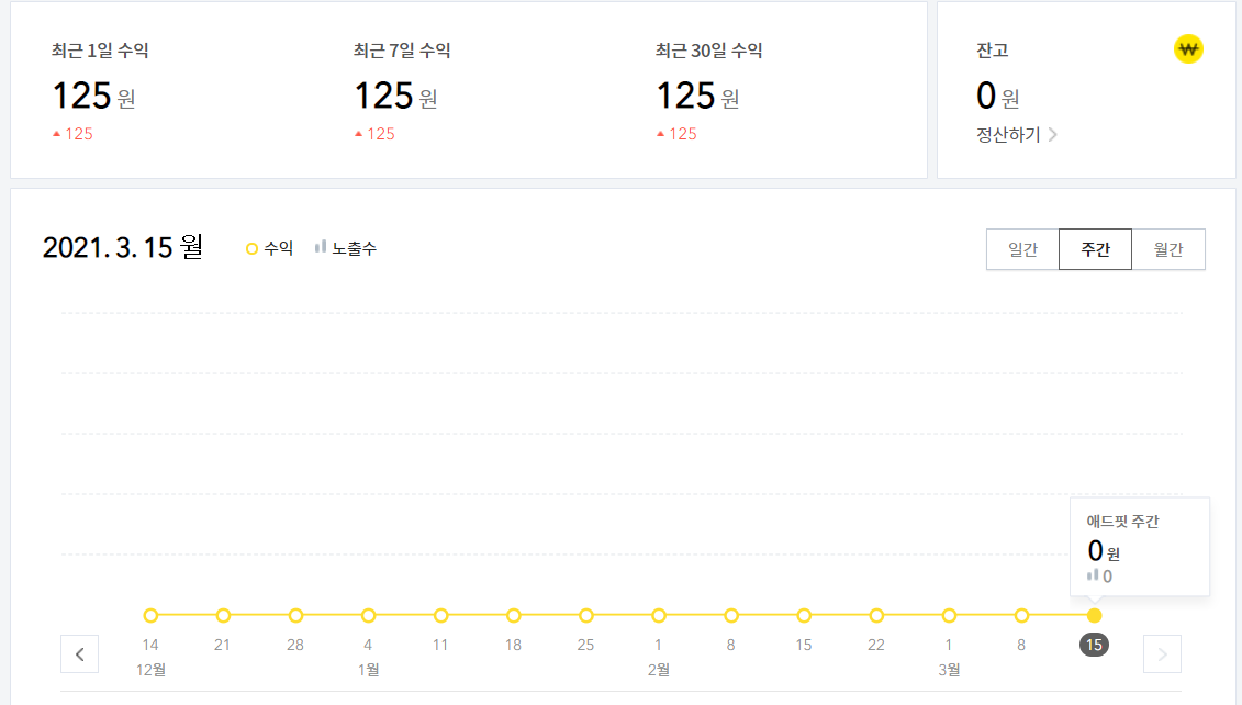 주간에는 수익이 하루 발생한 어제 애드핏 AdFit 수익이 집계가 안되는데 버그인 듯합니다.