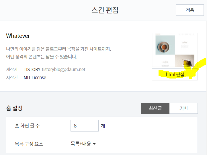 '스킨편집'으로 들어가서 화면 오른쪽 적용 버튼 아래에 있는 'html' 편집' 버튼을 클릭합니다.