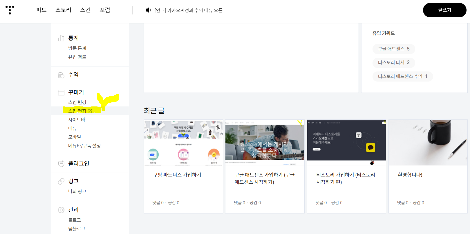 본인의 티스토리로 이동하시고 나서 바로 관리자 모드로 들어가신 다음 '스킨편집'을 클릭합니다.