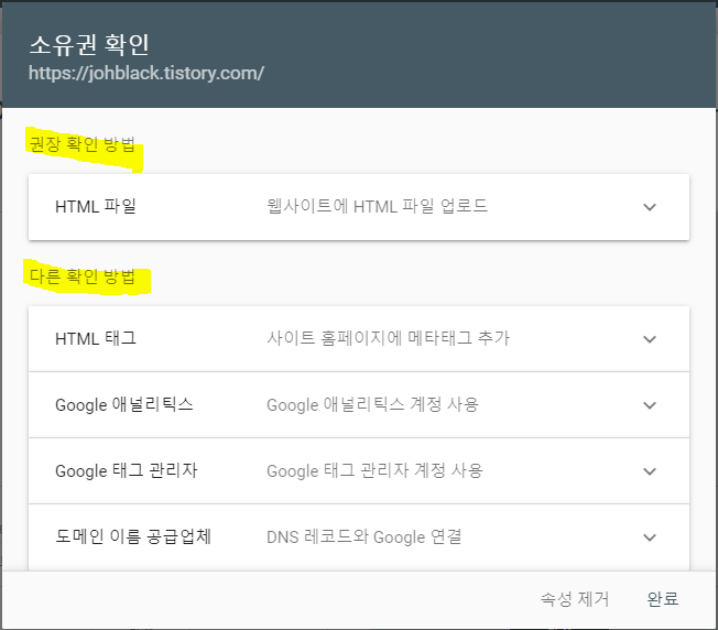 구글 서치 콘솔에 나타난 "소유권 확인" 방법이 한 가지가 아니라 권장하는 방법과 다른 확인