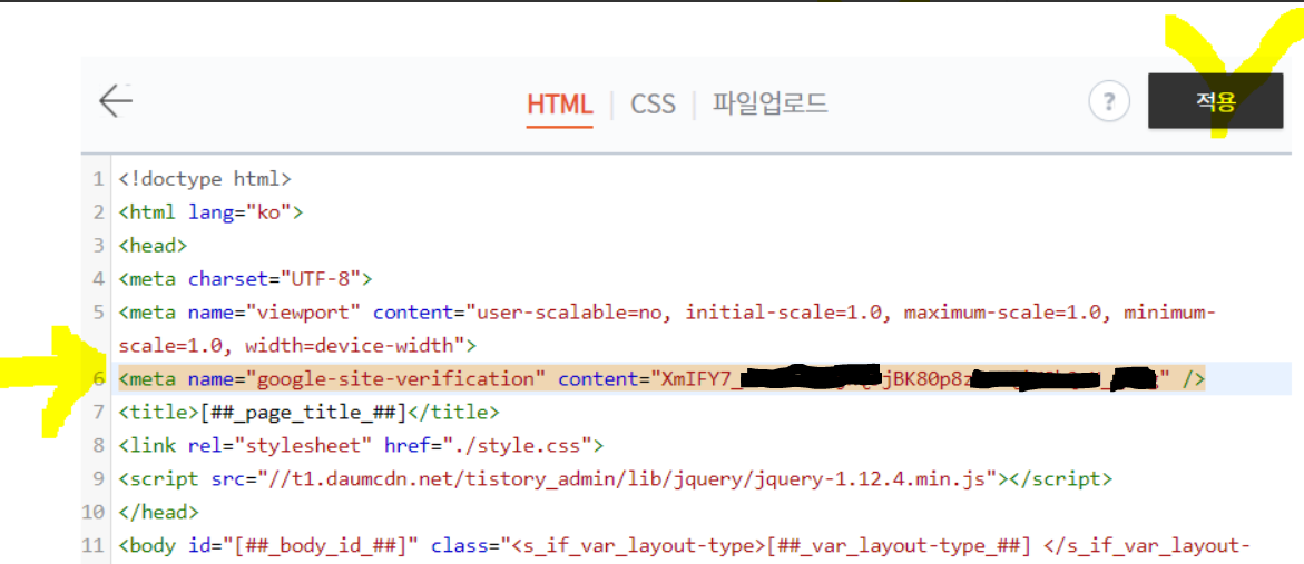 2) 메타태그 붙여넣기 (티스토리에서 진행)