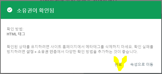 '확인' 버튼을 클릭하면 인증하는데 걸리는 약간의 시간을 거쳐서 소유권이 확인되었다는