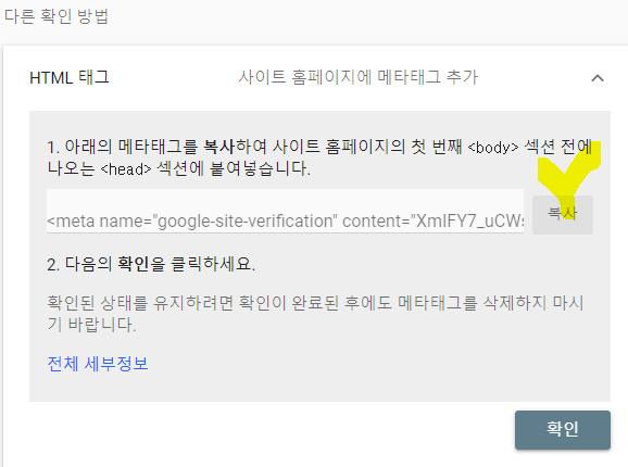 1) 메타태그 복사 (구글 서치 콘솔에서 진행)